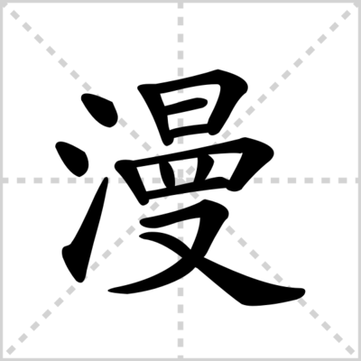 2、漫 读音:[màn]部首:氵 五笔:IJLC 笔 画: 14 释义 :水过满,四外流出,漾出来:河水~出河床。~溢。~流。~漶(文字、图画等因受潮而模糊不清,如“字迹~~”)。淹没:大水~过桥面。满,遍,到处都是:迷~。~山遍野。没有限制,没有约束,随意:散~。~谈。