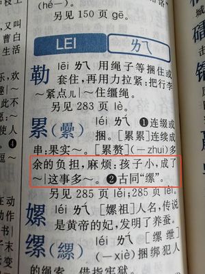 léi:累赘、累绁、累叠、累纸、闹累赘 基本字义:累:léi ㄌㄟˊ,lěi ㄌㄟˇ,lèi ㄌㄟˋ。“纍”简化为“累”。依据古人书法省笔简化。以鍫取田闲土块令方整不散是畾之范式。糸、畾两范式叠加。合箸得其理有条不紊而增或延及是累之范式。本义:指“累累”。