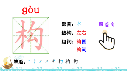 3、拼音:gòu。声母:g。韵母:ou。释义:构造;组合:构词。结成(用于抽象事物):虚构。指文艺作品:佳构。构树,落叶乔木,叶子卵形,叶子和茎上有硬毛,花淡绿色,雌雄异株。相关组词构成[gòu chéng] (动)形成;组成。