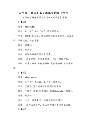 五年级下册语文生字表组词:北京的春节:蒜suàn、蒜头、蒜苗。醋cù、醋瓶、吃醋。饺jiǎo、饺子、水饺。摊tān、 地摊、摊牌。拌bàn、搅拌、拌面。眨zhǎ、眨眼、眨一眨。宵xiāo、元宵、通宵。燃rán、点燃、燃放。贩fàn、商贩、菜贩。腊八粥:腊là、腊月、腊肉。