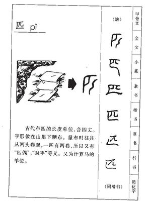 匹(拼音:pǐ),是汉语通用规范一级字。最早见于甲骨文。本义为布帛一匹,古代计算布帛长度的单位,引申有匹配、辅助义。