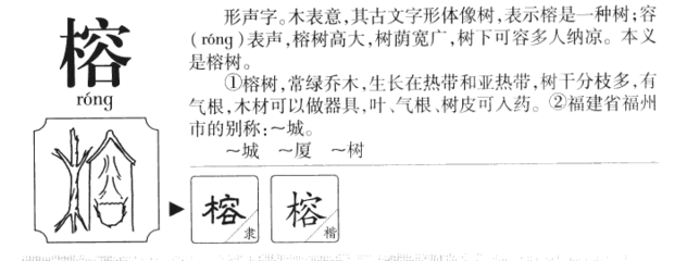 榕 róng 常绿乔木,气根细瘦,树冠大,隐花果生于叶腋,近扁球形。生长在热带和亚热带,木材可制器具。中国福建省福州市的别称:榕城。