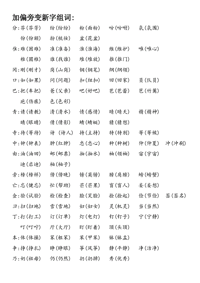 丁字加偏旁再组词是汉语中一种常见的组词方式。它的基本方法是在一个“丁”字旁边加上一个偏旁部首,再通过组合得到一个新的词语,从而丰富汉语词汇。下面是一些丁字加偏旁再组词的例子: 丁字加“木”旁,组成“丙”,表示木材的颜色。 丁字加“日”旁,组成“昔”,表示过去。