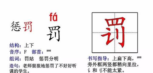 3、罚的拼音是:fá,组词有:罚款、惩罚、体罚,部首是:罒。常用释义 处罚,使犯规或犯罪的人受到惩戒。近义词:惩。反义词:赏、奖。例词:赏罚分明、罚款、惩罚、体罚。例句:他为人正直,赏罚分明,从不偏向任何人。详细释义 罪行。贪色为淫,淫为大罚。