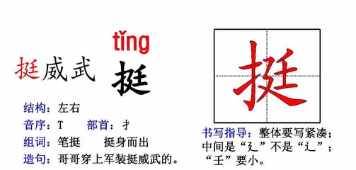 3、加“提手旁”变成“挺”字,组词:挺立。加“舟字旁”变成“艇”字,组词:快艇。加“广字头”变成“庭”字,组词:法庭。加“虫子旁”变成“蜓”字,组词:蜻蜓。加“金字旁”变成“铤”字,组词:铤险。加“雨字头”变成“霆”字,组词:雷霆。挺立[ tǐng lì ]笔直地耸立。