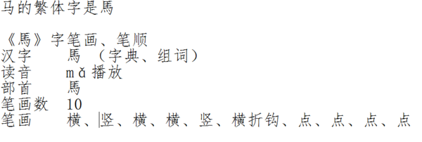 5、骑着马跑。马匹 [mǎ pǐ]马(总称)。马蹄 [mǎ tí]马的蹄子。马鬃 [mǎ zōng]马颈上的长毛。骒马 [kè mǎ]母马。立马 [lì mǎ]立刻:事情打听清楚了,~给我个回话。野马 [yě mǎ]哺乳动物。体形似家马。体长2米余。耳短小。鬃短而直。毛浅棕色。栖息于荒漠草原地带。