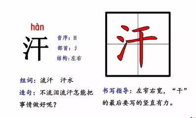 1、组词:冷汗、汗水、汗珠、汗颜、汗青。罕。拼音:hǎn。释义:捕鸟用的长柄小网、旌旗名、稀、少。