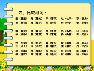 4、鹃的组词:鹃啼。鹃血。鹃魂。鹃嗁。子鹃。杜鹃。山鹃。大杜鹃。黄杜鹃。怨啼鹃。杜鹃花。杜鹃血。望帝啼鹃。