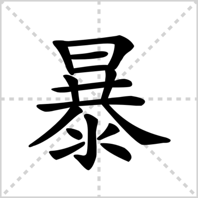 2、[bào ]强大而突然来的,又猛又急的:~雷。~病。~动。~力。~涨。~发。风~。~风骤雨(亦喻声势浩大、发展迅猛的群众运动)。过分急躁的,容易冲击的:脾气~躁。~跳如雷。凶恶残酷的:凶~。~虐。~君。~戾恣睢(残暴凶狠,任意胡为)。~政。横征~敛。