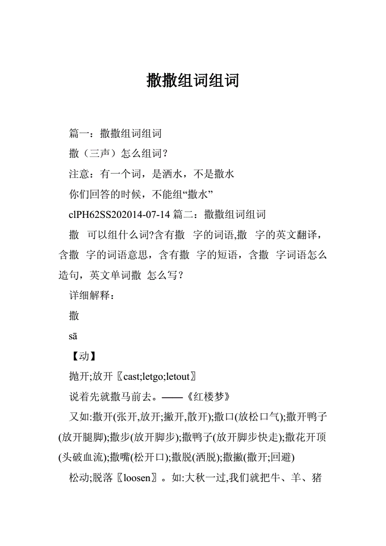 读sā时,组词如下:撒谎、撒娇、撒刁、撒气、撒手 读sǎ时,组词如下:撒播、喷撒、撒眸、撒盐、撒敦 释义:[ sā ]放开;张开:~手。~网。一~线,风筝就上去了。尽量使出来或施展出来(贬义):~赖。~酒疯。