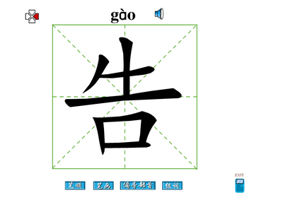 2、告的拼音:gào、告的组词如下:公告,告诉,预告,广告,告别,忠告,告示,告知,告辞,告捷,告退,告终,告状,告密,告罪,报告,劝告,告诫,告发,控告,布告,告吹,央告,宣告,警告,祷告,告罄,禀告 告的造句:我明天就要到北京上学了,今天特来和叔叔告别。