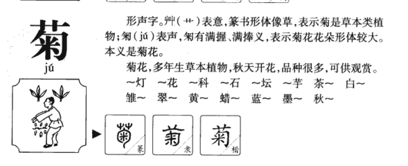 2、菊拼音:jú,组词组:霜菊、蜀菊、菊部、亭菊、菊糕、菊花、菊月、残菊、山菊、菊泉、菊枕、棚菊、菊天、球菊、篱菊、家菊 释义:多年生草本植物,秋天开花,是观赏植物,有的花可以入药,亦可作饮料:菊花。赏菊。春兰秋菊。姓。笔画数:11;部首:艹;菊 还束就菊花。