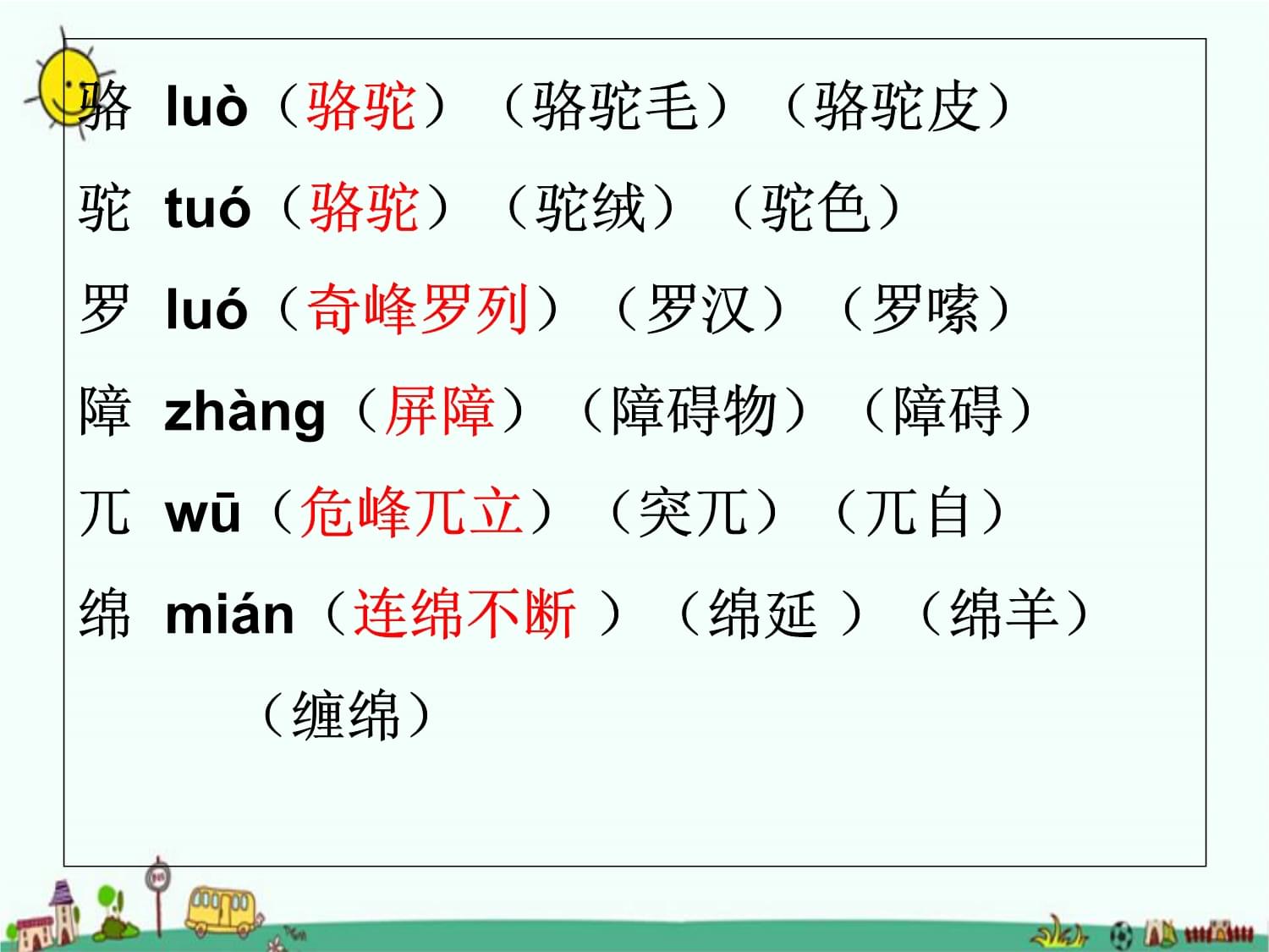 6、骆驼:[luò tuo]当驼是单字时候读第二声,而组成骆驼这个词时读轻声。哺乳纲,偶蹄目,骆驼科。反刍家畜。体型大,头小颈长,体毛浓密。背上有驼峰,内含脂肪。可供驮、骑和役用,号称“沙漠之舟”。