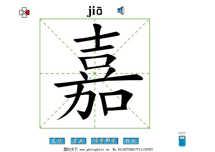3、嘉 拼音: jiā 笔画: 14 部首: 口 五笔: fkuk 基本解释嘉jiā 善,美:嘉言。嘉宾。嘉言懿行。夸奖,赞许:嘉奖。嘉许。嘉勉。吉庆,幸福:嘉祥。嘉偶。欢乐:嘉会。姓。