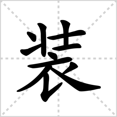 2、拼音:zhuāng。部首:衣。组词:化装、装束、装饰、装扮、拼装。部外笔画6画,总笔画12画。五笔UFYE,仓颉LGYHV,郑码TISR,四角34732。结构上下,电码5944,区位5516,统一码88C5。笔顺:丶一,一,一丶一ノフノ丶。基本字义:穿着的衣物:服装。便装。军装。中山装。装裹。