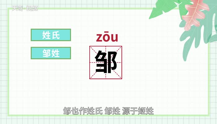 4、“邹”没有多音字,只有一个读音。读音:[zōu]。释义:姓氏 释义: 中国周代诸侯国名,在今山东省邹县东南。 姓。