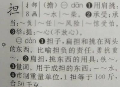 3、[ dǎn ]同“掸”。组词有担当、承担、担待、担忧、担保、担任、扁担、担子、重担、担心、石担、担架、分担、担负等。