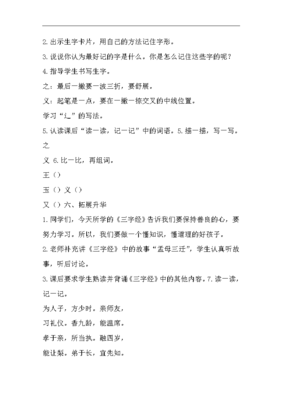 教学重点:理解并背诵《三字经》从人之初,性本善到教不严,师之惰。以文章内在含义指导自己的行为,为学生创设传统文化的氛围,激发学生学习传统文化知识的兴趣。教学难点:明白教育和学习对儿童成长的重要性。教学时间:一课时。