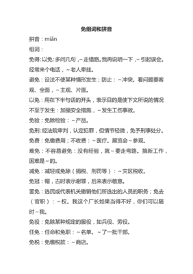 1、免的拼音: miǎn wèn。组词:难免、免冠、免费、免职、减免、黜免、免役、赦免、免税、幸免、任免、蠲免、罢免、免试、免除、免票、免礼、不免、自免、遗免、免臣、免征、闵免、病免、偷免、解免、甄免、卖免、责免免役法、在所难免。