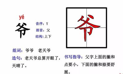 3、部首:父 拼音:yé 意思:称呼父亲。称呼祖父。对长一辈或年长男子的尊称。旧时对主人、官僚、财主等的称呼。迷信的人对神的称呼。