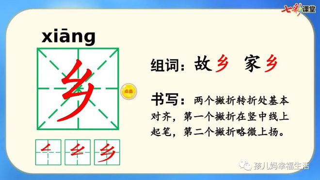 3、“乡”字有三画 笔顺:撇折、撇折、撇 第一画是“厶”去掉一点。读音:[xiāng ]释义:泛指小市镇:~村。穷~僻壤。自己生长的地方或祖籍:家~。故~。~井。~里(a.家庭久居的地方;b.同乡的人)。~党(乡里)。~试。中国行政区划基层单位,属县或县以下的行政区领导。