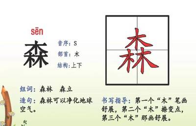 组词:森林、森立、森森、森然、森郁、阴森、森邃、森严 笔画数:12;部首:木;释义:树木众多,引申为众多、繁盛:森林、森立、森森、森然、森郁。幽深可怕的样子:阴森。森邃。严整的样子:森严。