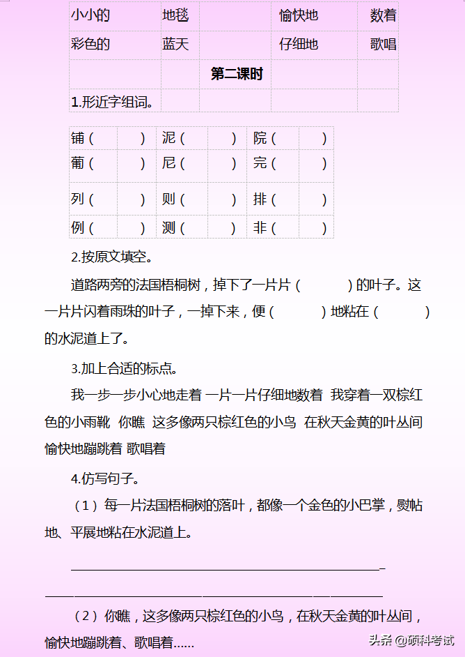 3、形近字有:埃挨,斑班,辫瓣,辩辨,梆绑,壁璧,睬踩,仓仑,沧沦,侧测,狠恨,弛驰,纯绝,悴粹,蹈稻,忖村,瞪蹬,掂惦,凋调,叮盯。形近字是指几个字形机构相近的字。