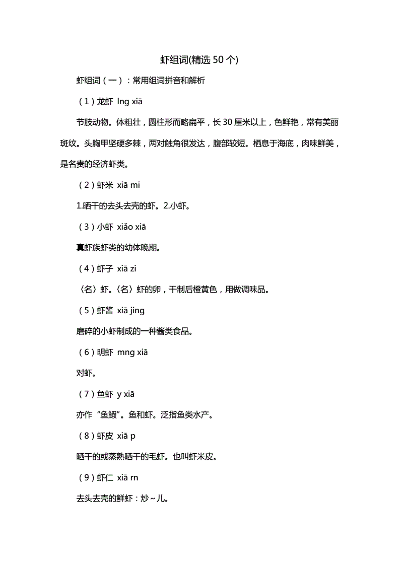 —— 虾,读音有二: 音呷xia第一声。两个字的词语约有55个,举例:醉虾,虾虎,虾兵,明虾,虾公,龙虾等。 音蛤ha第二声。词语一:蛤蟆。