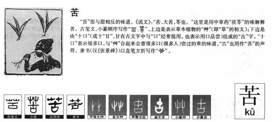 2、苦字怎么组词:苦寒、疾苦、苦胆、苦痛。哀苦、寒苦、苦功、惨苦。叫苦连天、愁眉苦脸、劳苦功高。不辞劳苦、孤苦伶仃、埋头苦干。艰苦卓绝、辛辛苦苦、冥思苦想。苦字是形声字。此字始见于《说文》中的小篆文字中。