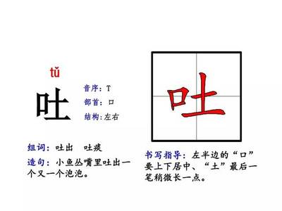 4、吐字的读音有:[tǔ][tù]。吐,读音[tǔ],组词(吐痰、谈吐、吐露、吐气、吐弃、吐穗、吐絮、吐蕃)。吐,读音[tù],组词(呕吐、吐血、吐沫、吐泻)。