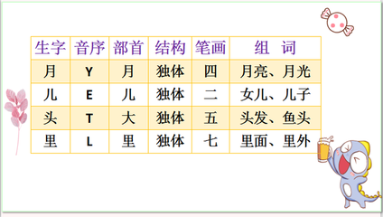 2、组词:日月 真是光阴似箭,日月如梭,一转眼又到了春节。组词:月亮 夜幕降临了,弯弯的月亮挂在西边的天空。月拼音yuè 地球最大的天然卫星(亦称“月亮”、“月球”):月光(月球反射太阳的光)。