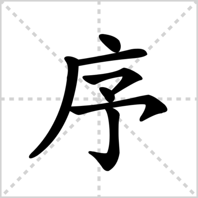 序的组词:序跋、标序、策序、副层序、倡序、辰序、程序、编程序、子程序、主程序、翅序、齿序、词序、_序、次序、倒序、第序、笃序、序的笔顺是点、横、撇、横撇。