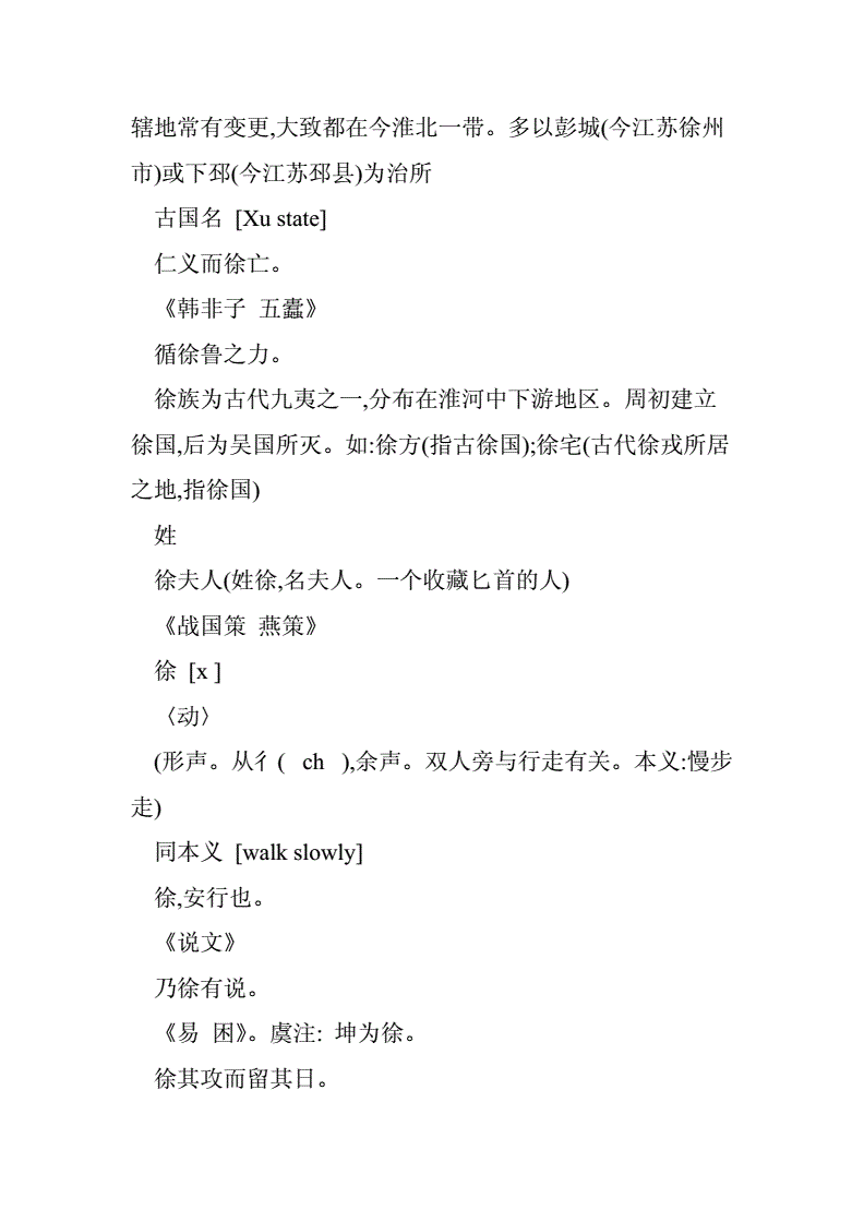 徐步】慢慢的走 【执徐】古时以干支纪年,岁在辰为执徐 【舒徐】从容不迫 【徐行】舒行徐步,边吟边走 【徐言】低声细语。从容而言。犹缓言。缓气言之。【疾徐】快慢 【徐福】徐市 【徐顾】方言。