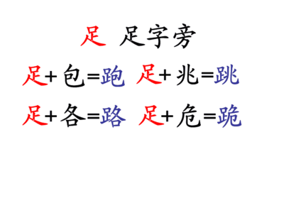 “足字旁”可以组跑、踢、跳、跟、踩、跋等等。跟 读音:gēn 部首:足 笔画:13 释义:脚的后部,踵;鞋袜的后部;随在后面,紧接着;赶,及;和,同;对,向。