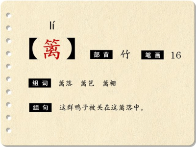 4、篱的组词:芭篱、巴篱、笆篱、笆篱子、篦篱、东篱、樊篱、篱樊、麂目篱、麂眼篱、接篱、白接篱、槿篱、篱槿、菊篱、篱菊、阑篱、篱笆、篱的笔顺是撇、横、点、撇、横、点、点、横、撇、点、竖折。