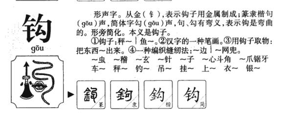 2、①钩子。②汉字的笔画,附在横、竖等笔画的末端,成钩形。③用钩子搭、挂或探取。