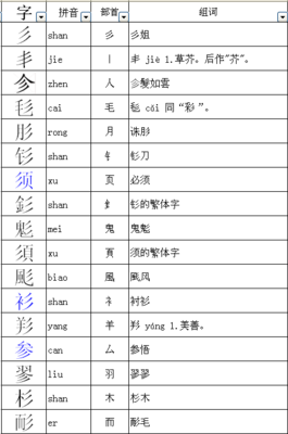 6、[ shān ]常绿乔木,树干很高很直。木材白色,质轻,有香味,可供建筑和制器具用。[ shā ]义同(一):~木。~篙。