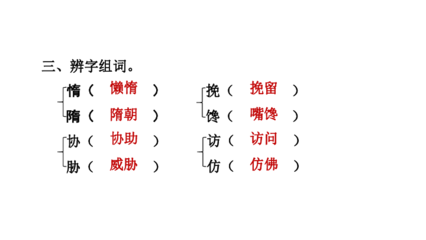 3、惰组词 : 惰民、惰懒、惰劣、肆惰、贪惰、退惰、偷惰、猥惰、违惰、懈惰、慵惰、窳惰、怯惰、偏惰、慢惰、懒惰、旷惰、骄惰、隳惰、浮惰、惰傲、惰力。
