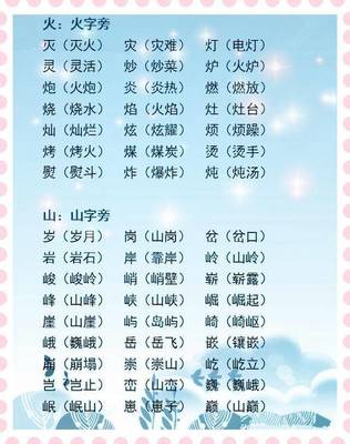 2、词语全是火字旁组词:烧灼,烽烟,燃烧,烧烤,炊烟,火爆,焰火,火烛,爆炸,灰烬,烯烃,烷烃,炔烃,焚烧,煤炭,熨烫,灯火。