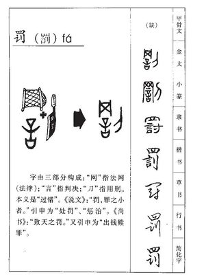 罚(拼音:fá)是汉语一级通用规范汉字(常用字)。此字始见于西周金文。许慎《说文解字》认为此字从刀、从詈(lì),表示没有用刀对人进行伤害,只是拿着刀骂人,就应该受到处罚。